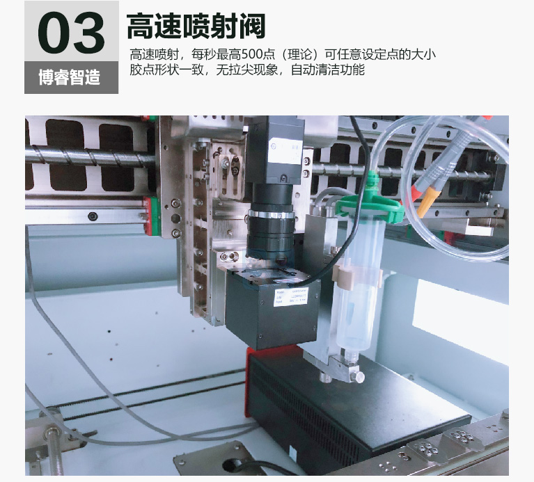 高速、高可靠性、高穩定性 高速噴射 可任意設定點的大小 最高涂料粘度可達25萬CPS 膠點形狀一致,無拉尖現象 自動清潔功